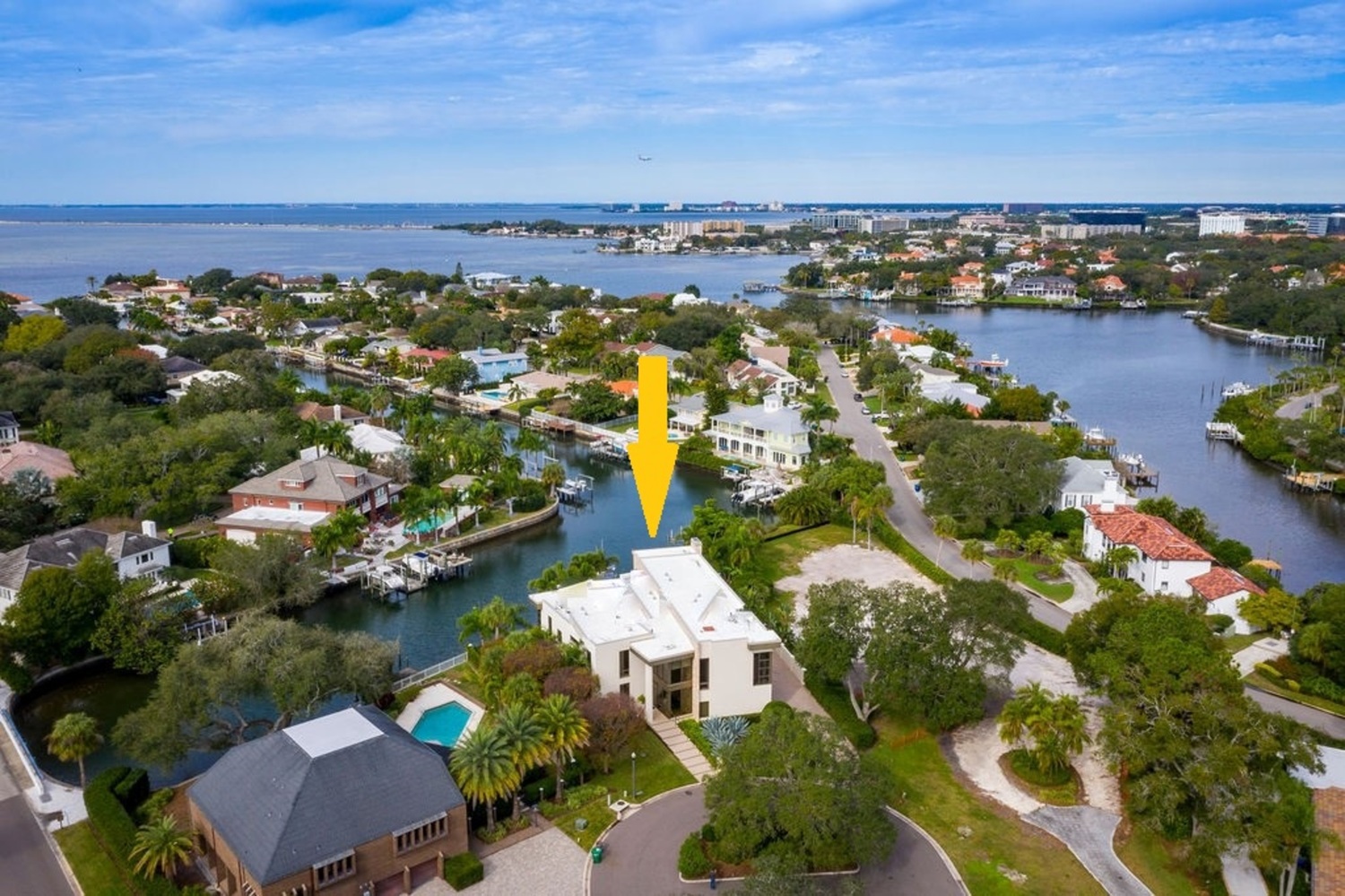 Welcome to a stunning classic modern waterfront estate located in the sought-after community of Culbreath Isles. Built to commercial standards, this home boasts dramatic living spaces, soaring ceilings, and walls of glass overlooking 140 feet of waterfront. Located just minutes to the open bay, in protected water canal frontage with a dock and 13,000 lb boat lift. This classic modern interior features sleek finishes and tons of light, polished travertine, imported Italian stone on walls and floors, and walnut wood flooring and trim details. The first floor features an entry with room for a piano, formal living and dining room, family room, den/office, powder bath, study space, additional office, and bonus/media room with a large full pool bath access. A chef’s kitchen is designed for entertaining with top-of-the-line stainless appliances (Wolf, Thermador, Sub-Zero, Miele), additional refrigeration, dual dishwashers and custom walnut cabinetry overlooking the pool. The second level, accessible via two staircases or elevator, offers a spacious loft, game room with private terrace, inviting master retreat with expansive master bath featuring a soaking tub and his/her water closets, separate walk in closets, plus a flexible bonus space inside the master suite area (sitting/sleeping, project room, nursery or third closet space). The second-floor features 4 additional bedrooms each with ensuite baths. Two bedrooms feature study/play lofts accessed via stair system; a third bedroom features cantilevered glass-walled reading nook. Enjoy outdoor entertaining and the best of waterfront living with a gracious terrace, lap-length pool, covered entertaining area, gas grill connection and gas fireplace. Fortified construction includes steel-reinforced block exterior and concrete foundation, stone feature wall extends through exterior-interior and triple-pane high-velocity impact resistant– Low E (hurricane-rated) windows. Additional appointments include an elevator, motorized shades, soaring wood slatted ceilings with sound control, concrete subfloor between floors, home sound system and impressive floating staircase with steel railing systems, generator and 3-car garage in this popular south Tampa gated community in the Plant School District.