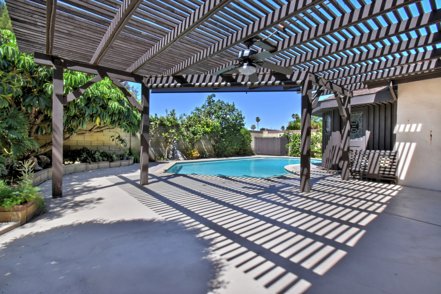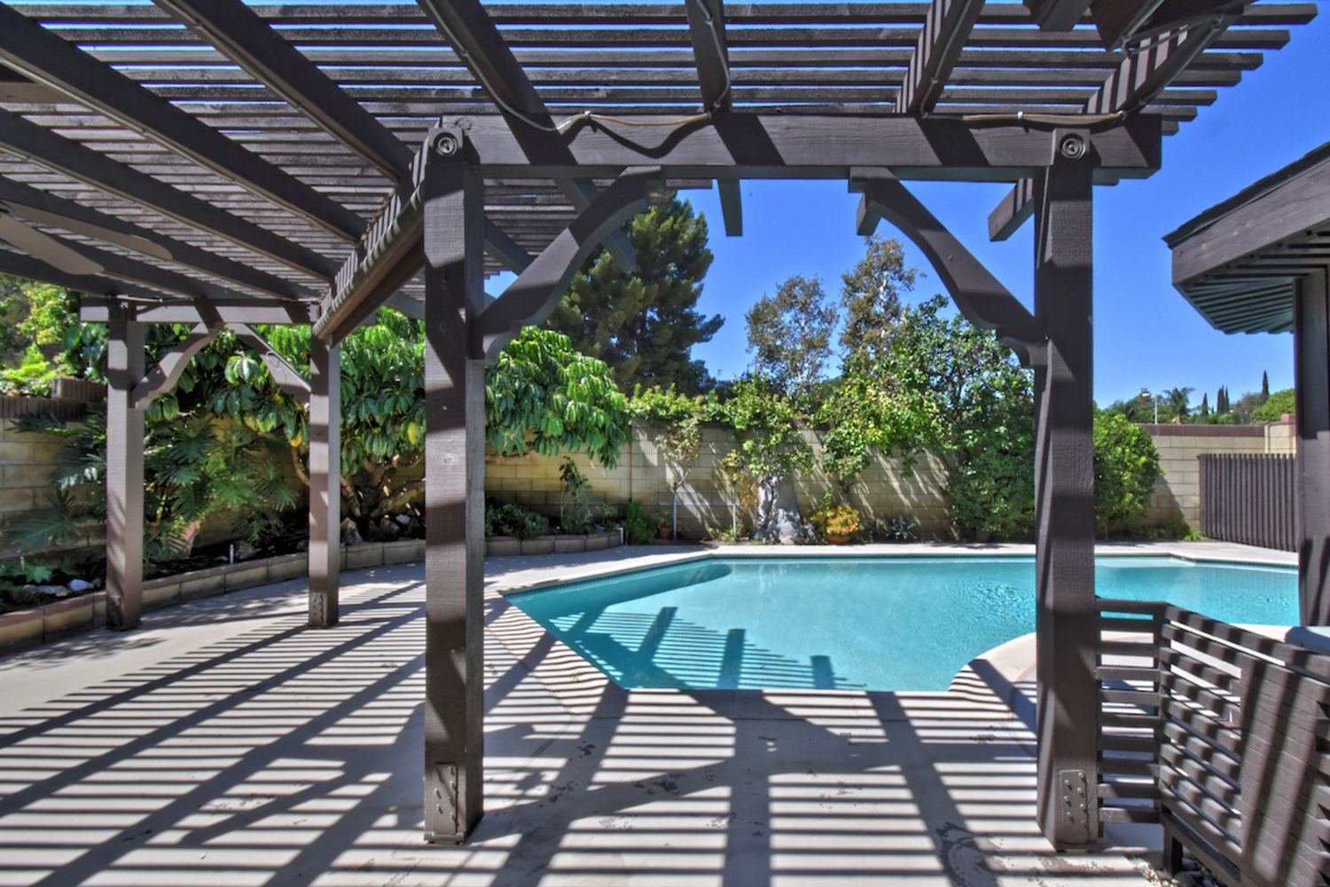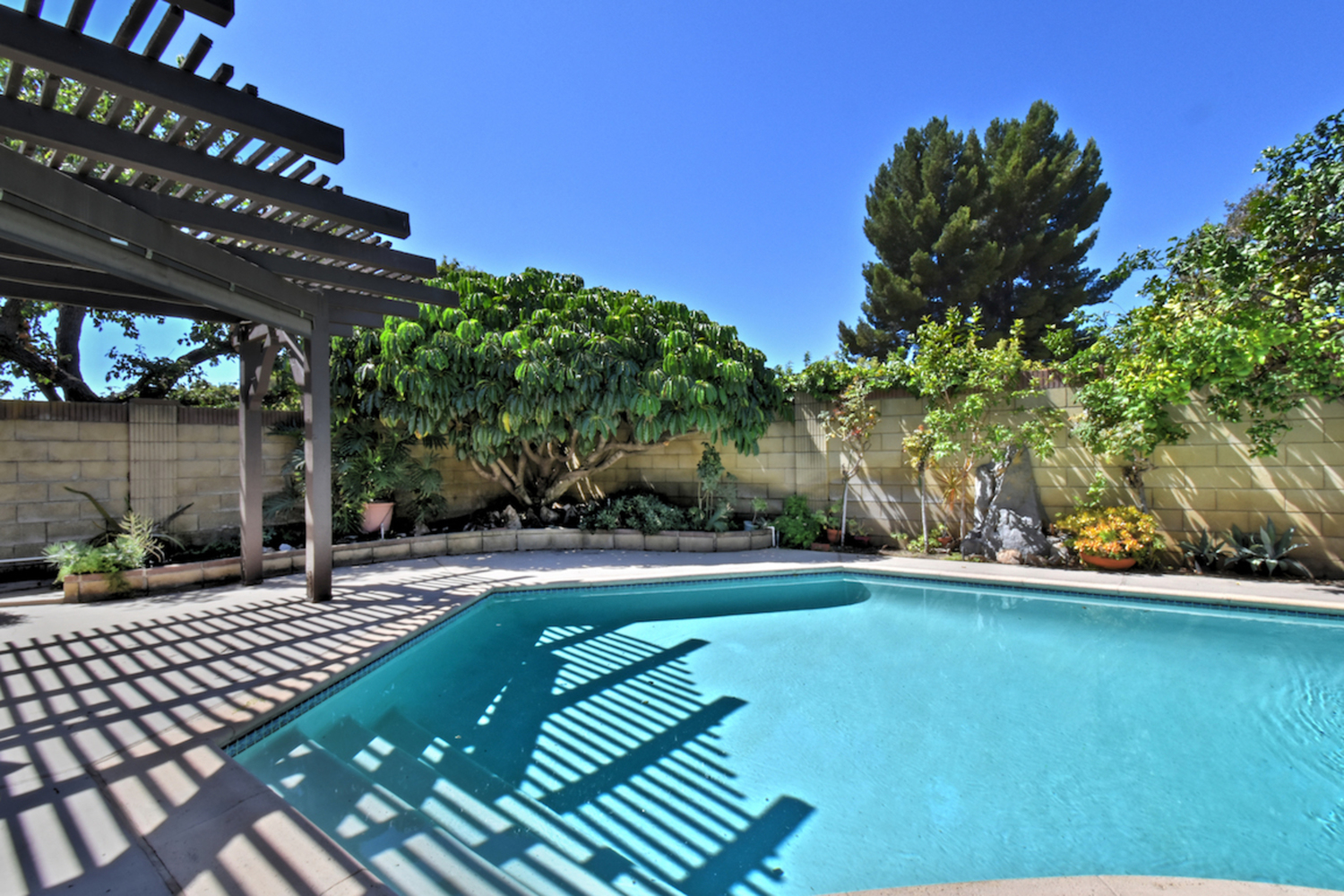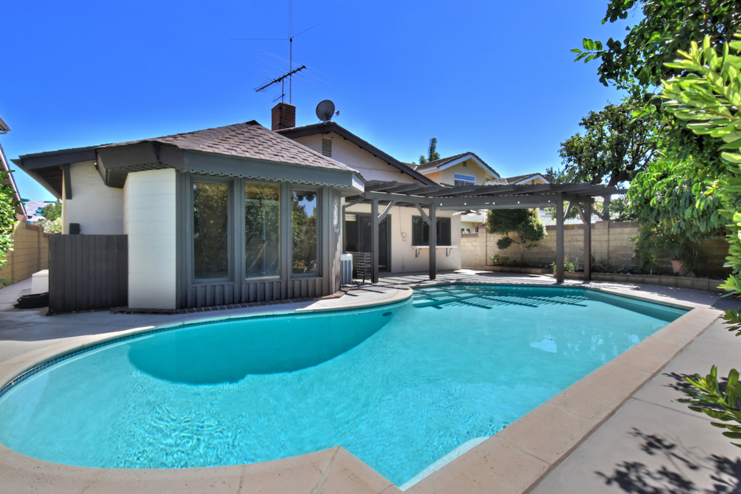 Located on a cul-de-sac in an established, highly sought-after neighborhood, this classic Valley Village home offers an airy interior with ample square footage and a private backyard with a resort-like pool and a pergola-shaded patio area. The attention to detail, love and pride of ownership is evident throughout this home, which has a double door entry surrounded by lush tropical landscaping, a natural stone façade and a large open concept living room/dining room area with soaring cathedral ceilings. The family room has a custom entertainment center and a walk-behind wet bar; sliding glass doors that open to the backyard and a stone fireplace add to the warm and comfortable atmosphere. A window box herb garden brings sunlight into the breakfast room/kitchen, which has functional appliances, custom cabinets and vintage ceramic tile in great condition. The nearby patio is perfect for dining outside; the secondary bedroom is ideal for a bedroom or home office. With vaulted ceilings and a large bathroom with dual sinks, the master suite is a relaxing place to finish the day. Other highlights include plenty of storage space and an attached two car garage. Available for the first time in 50 years and located nearby local freeways, shops and restaurants, houses of worship and Valley College, this home is the opportunity of a lifetime.