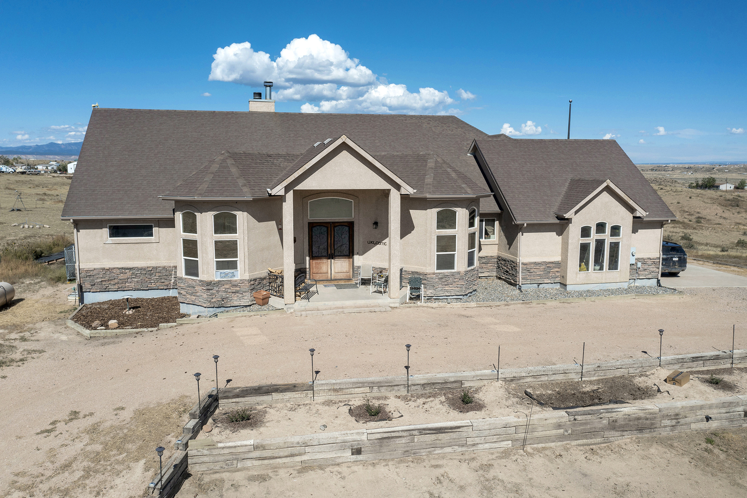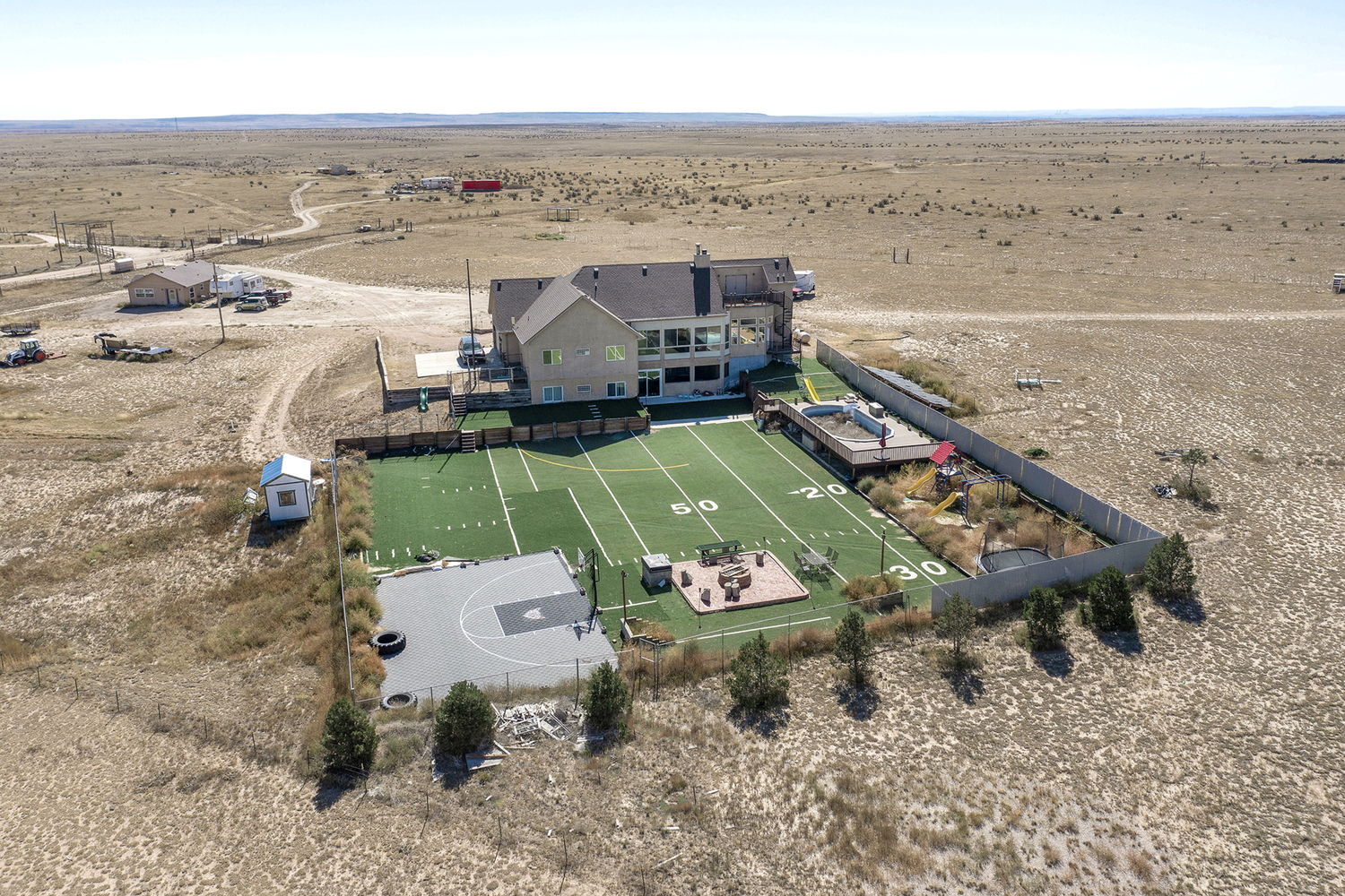 Walk into this beautiful stone and stucco home through the tile entry. You will immediately see the living room with a massive floor to ceiling stone fireplace. As a focal point the ceiling was hand textured, Turn into a large dining and kitchen area with granite island, maple cabinets and large pantry. There is also a formal dining room off the living and a lovely covered porch with great views of the backyard and surrounding mountains. The main level also boasts a decadent master suite, along with a luxurious 5-piece bath with an oversized stone jetted tub and double-sized tiled shower, plus a spiral staircase that leads to a 12x15 outdoor observatory deck. Two additional bedrooms that share a Jack-n-Jill bath completes the main level. Moving to the walkout lower level, you are overwhelmed with a large entertainment room with a fireplace and wet bar/kitchenette area. Further amenities include a large exercise room, game room, 2 bedrooms, 2 baths and a second covered porch that walks out to the amazing backyard. Further, there is a 1,000 sq. ft. guest house with 1 bedroom, living room, dining room, kitchen and bath. Other structures include a large barn and 2 smaller stables. The property is fully fenced and includes a 250 yard shooting range, plus fenced backyard with sports court, above ground pool, artificial turf and firepit area.
